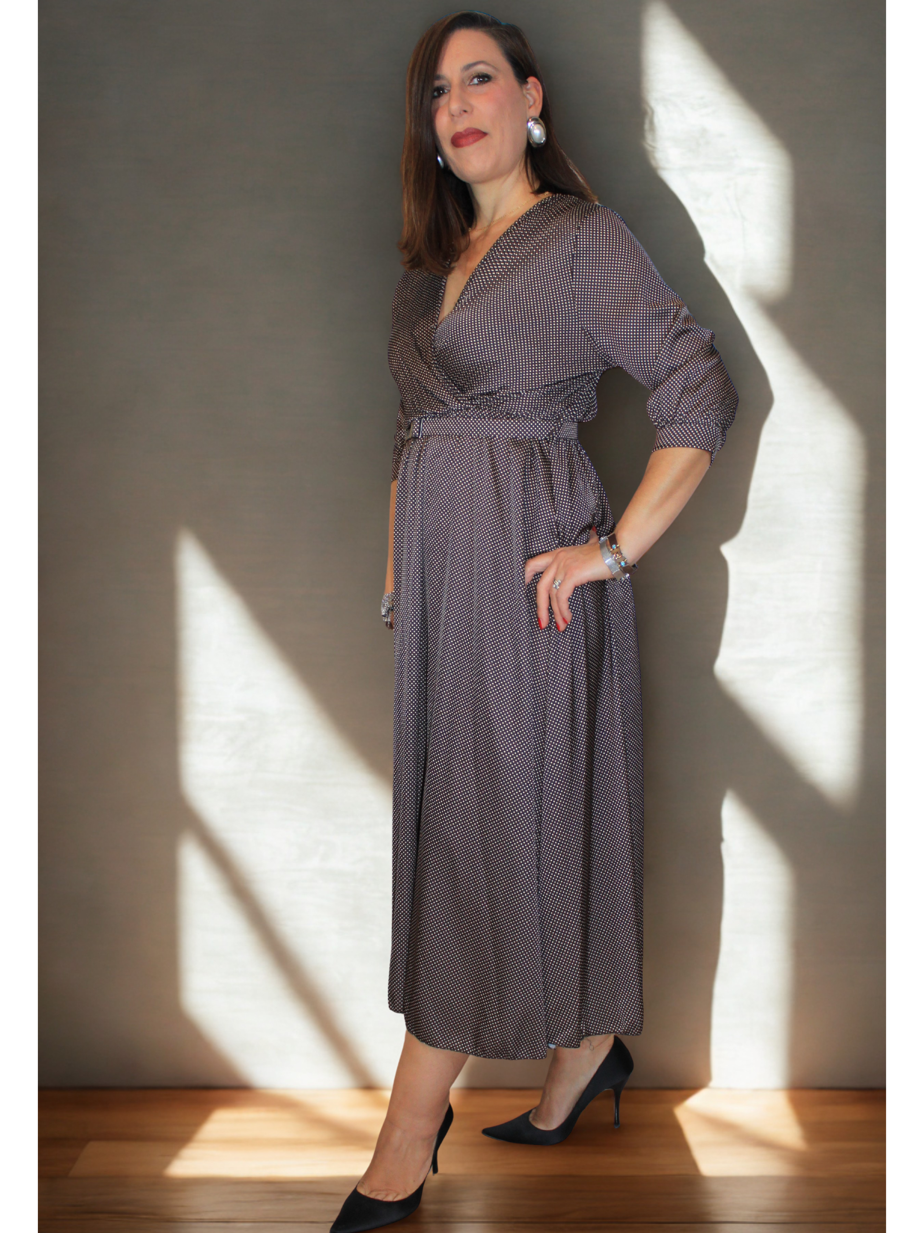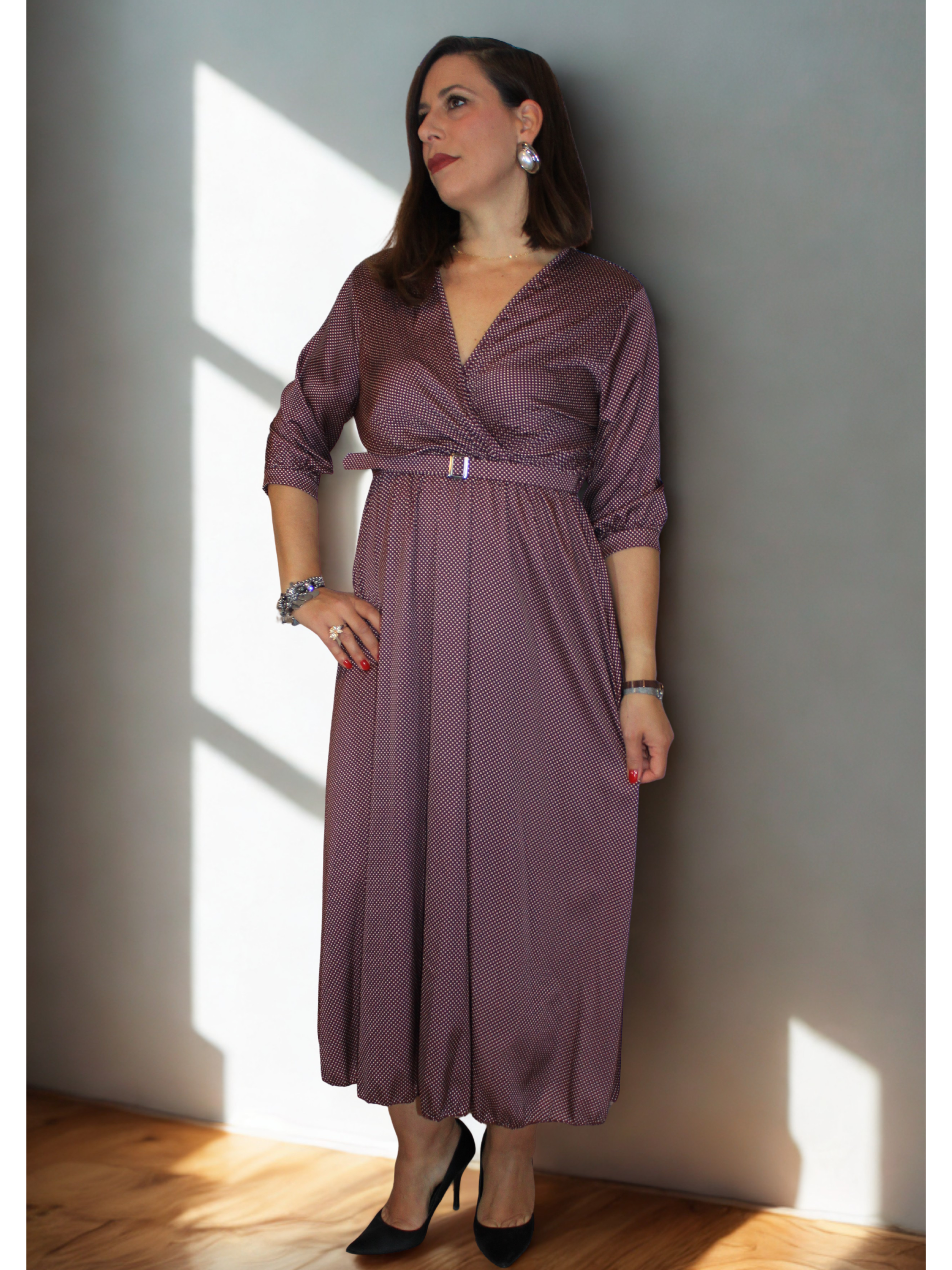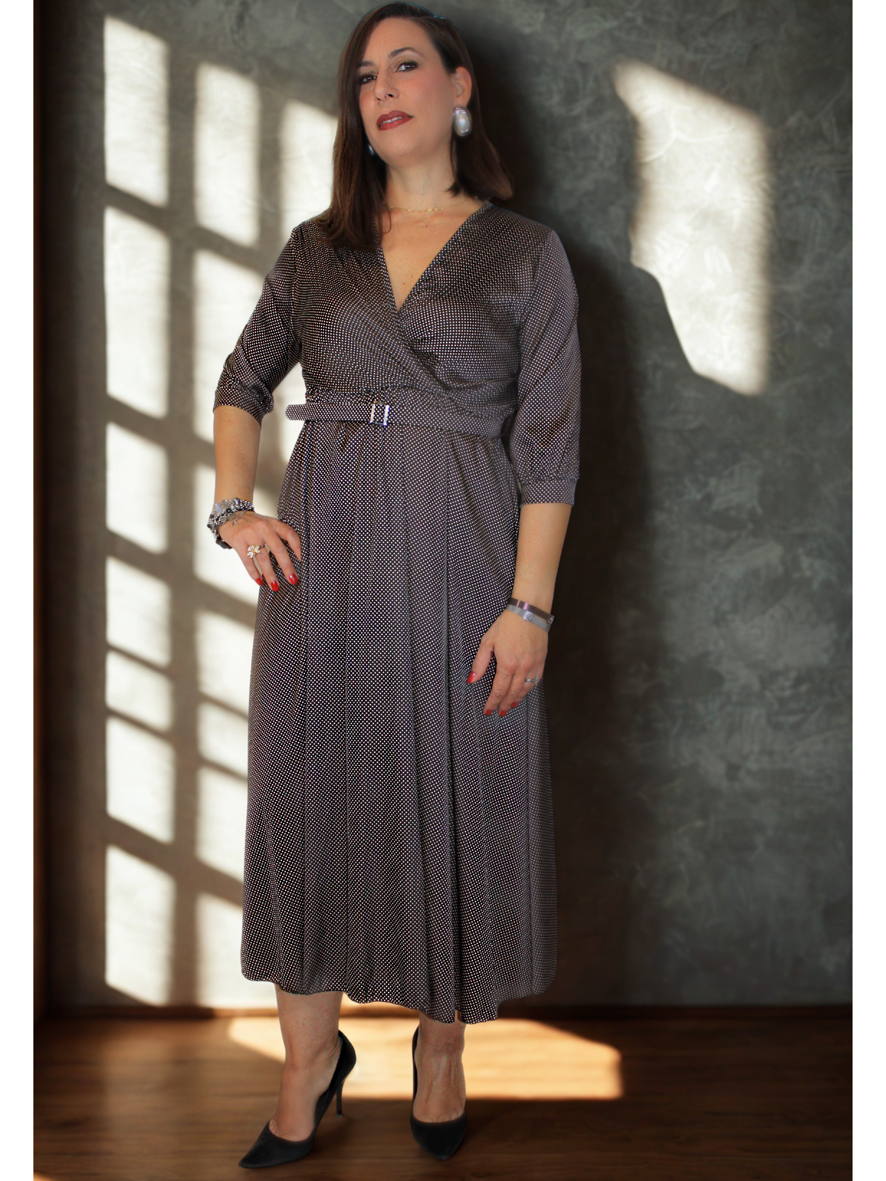 Abito a Pois con manica tre quarti e cintura in vita.