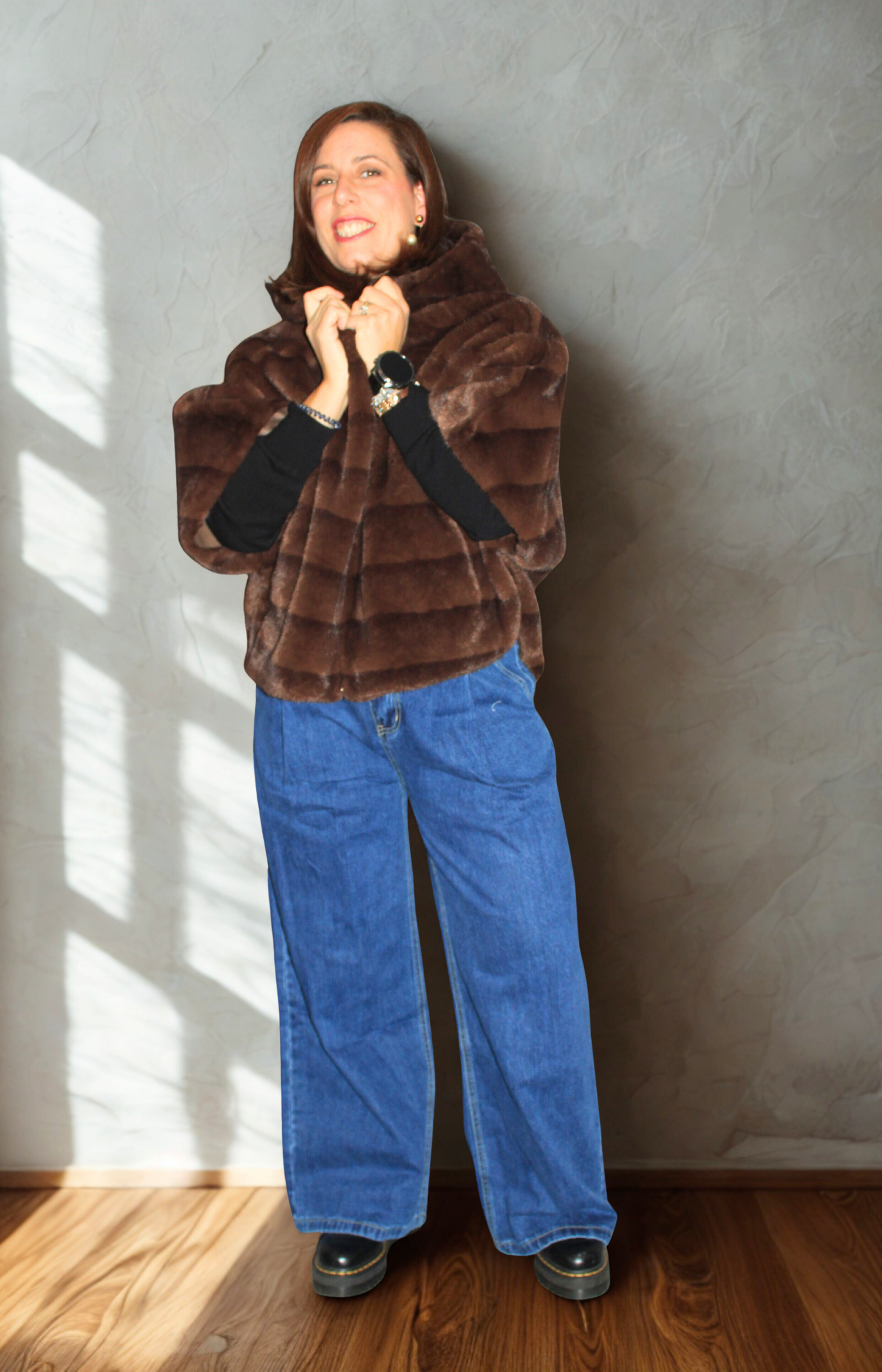Realizzata in ecopelliccia di alta qualità, questa giacca dona una sensazione di calore senza risultare ingombrante, ideale per le giornate più fresche e per chi cerca un capo leggero ma distintivo. Facile da abbinare con vestiti, jeans o pantaloni, è perfetta per creare outfit eleganti ma confortevoli, adattandosi con semplicità a molteplici occasioni.