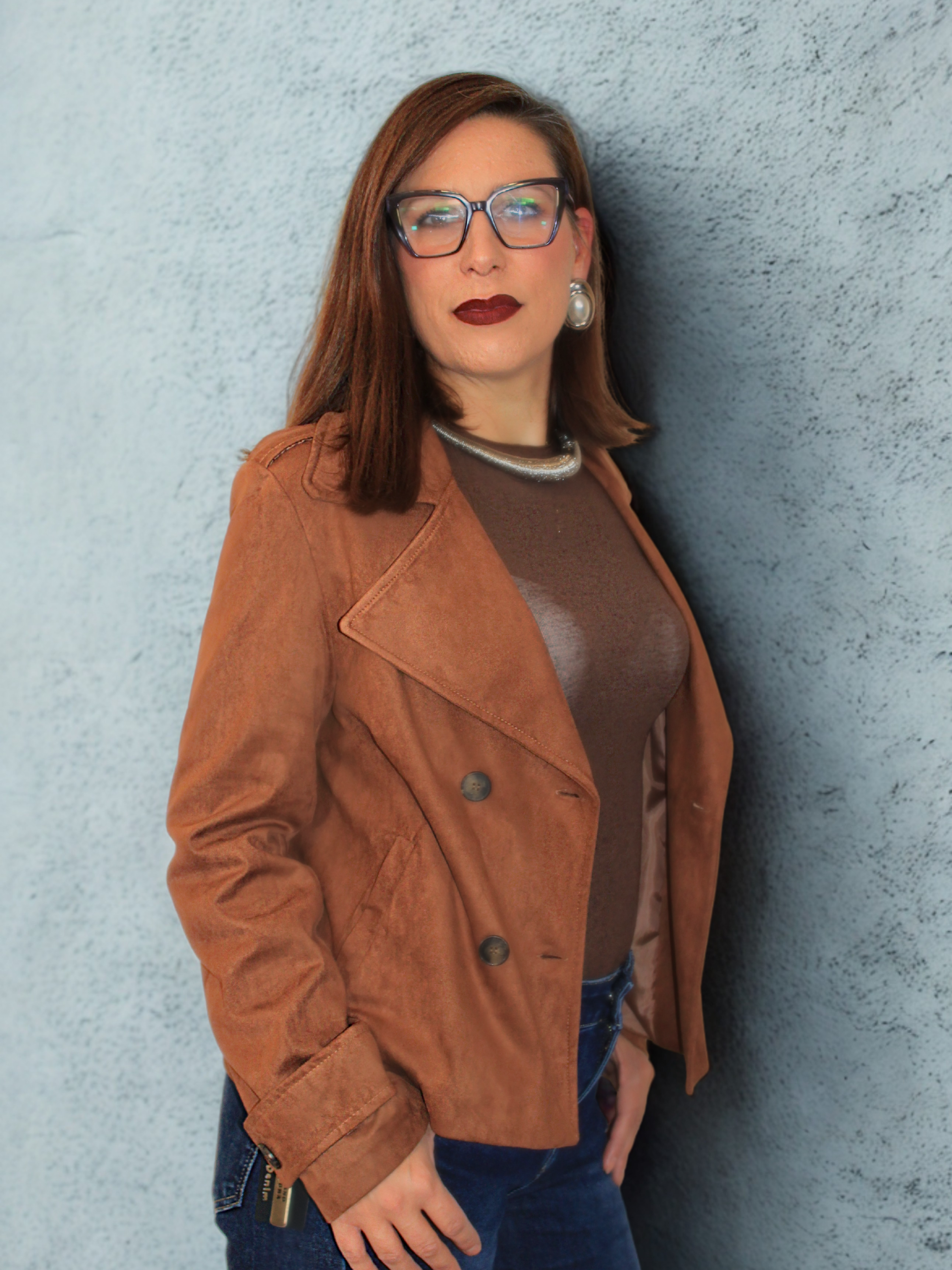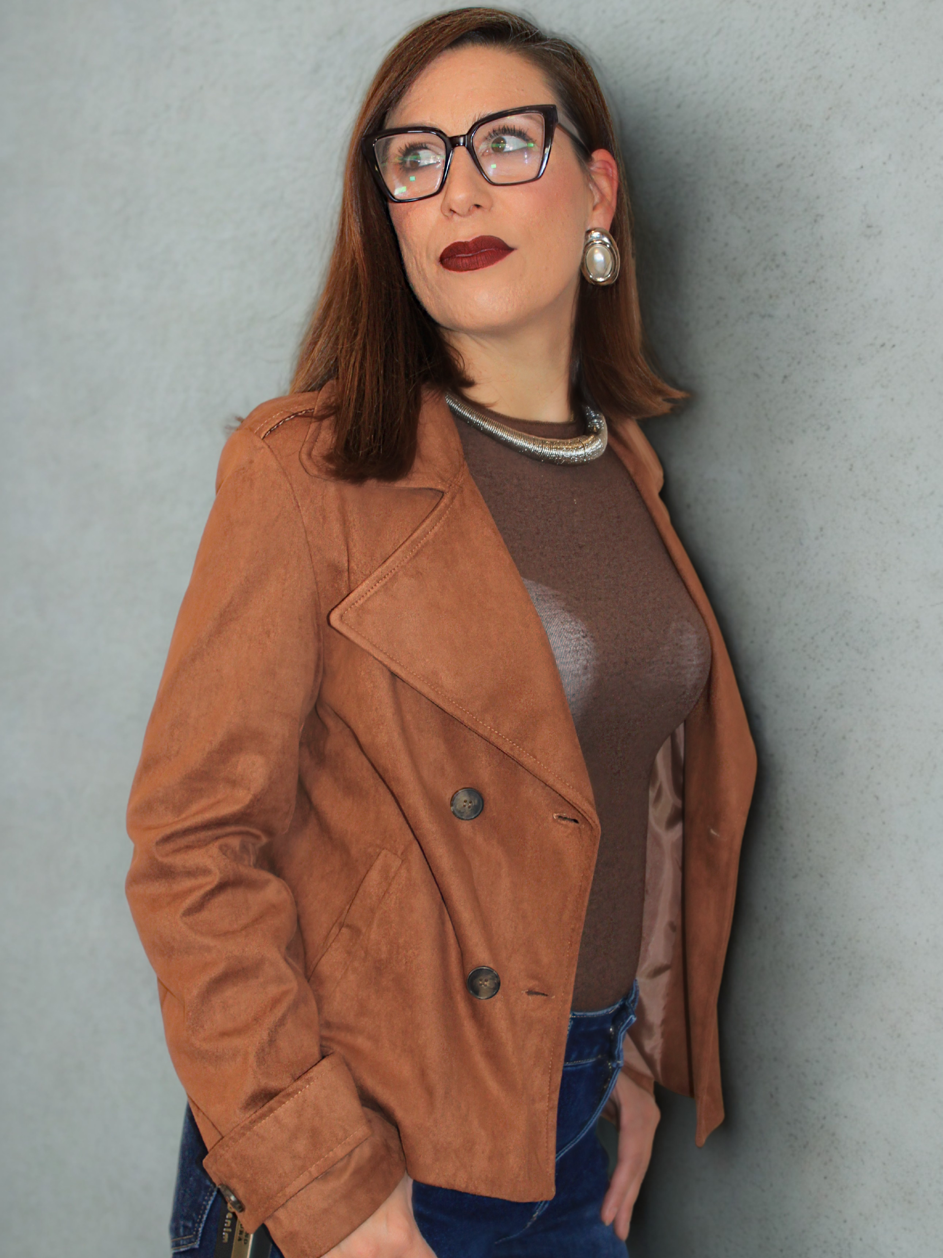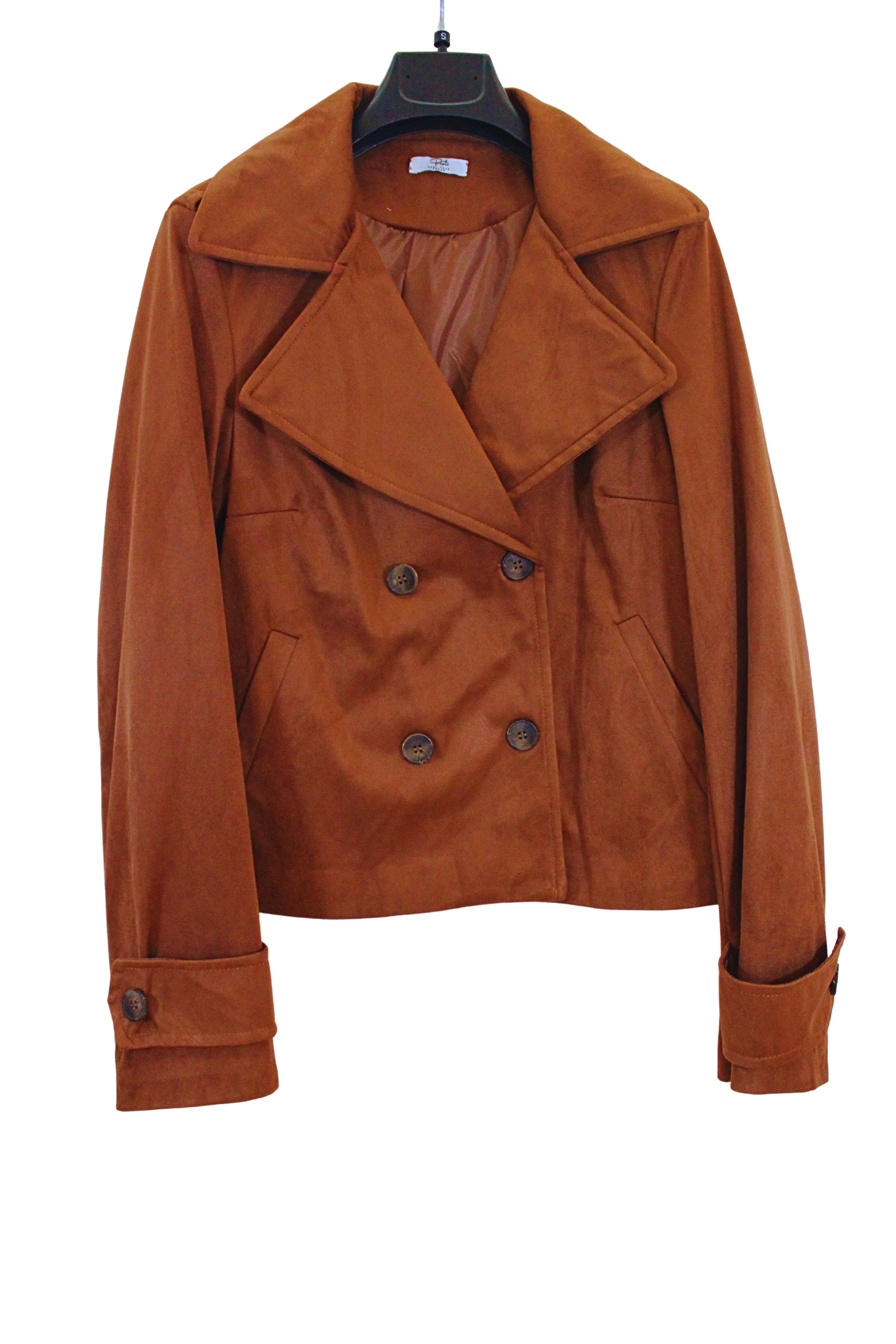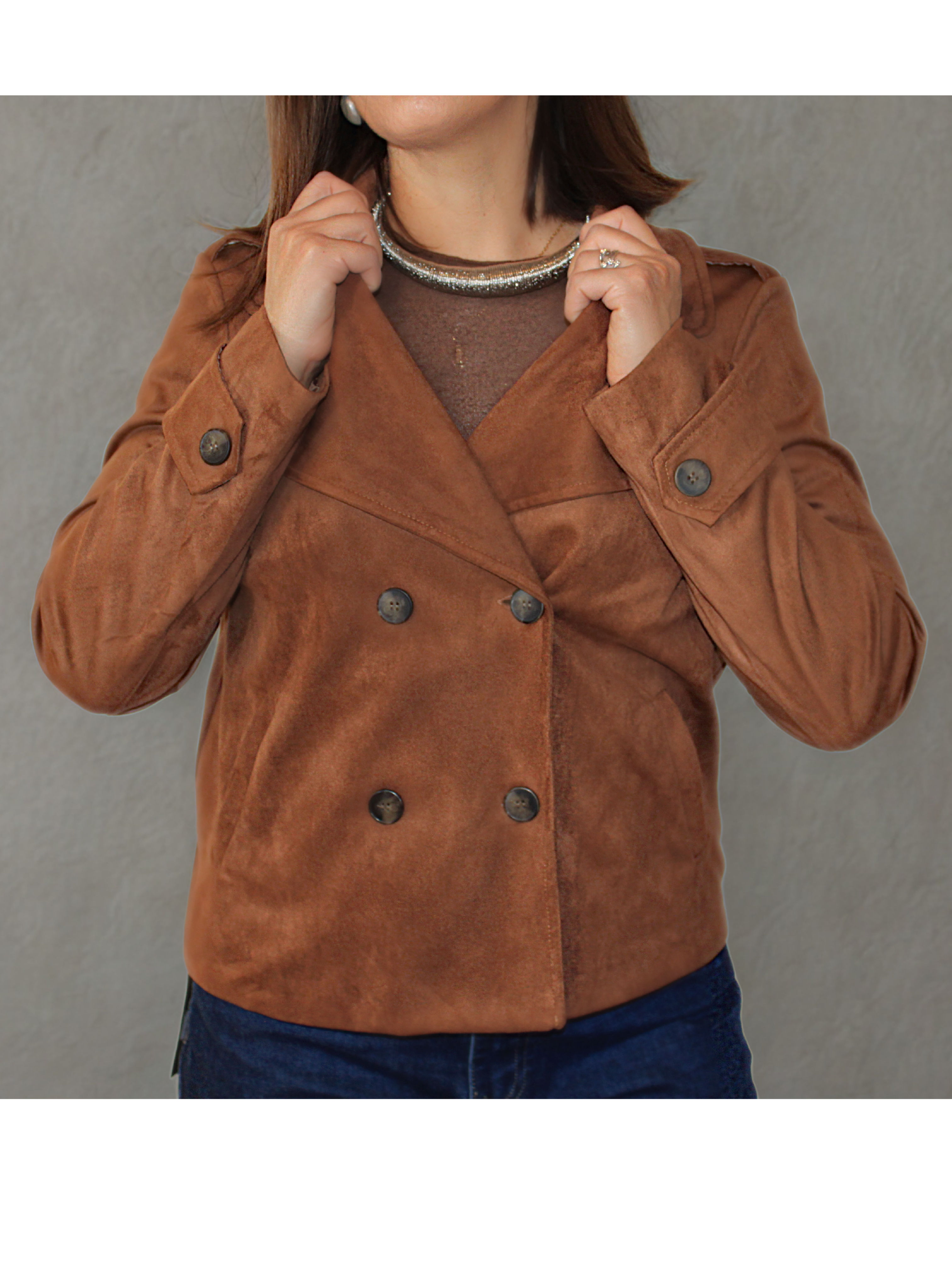 Giacca con bottoni in doppio petto, colletto a bavero e tasche anteriori. Bottoni decorativi sulle maniche.