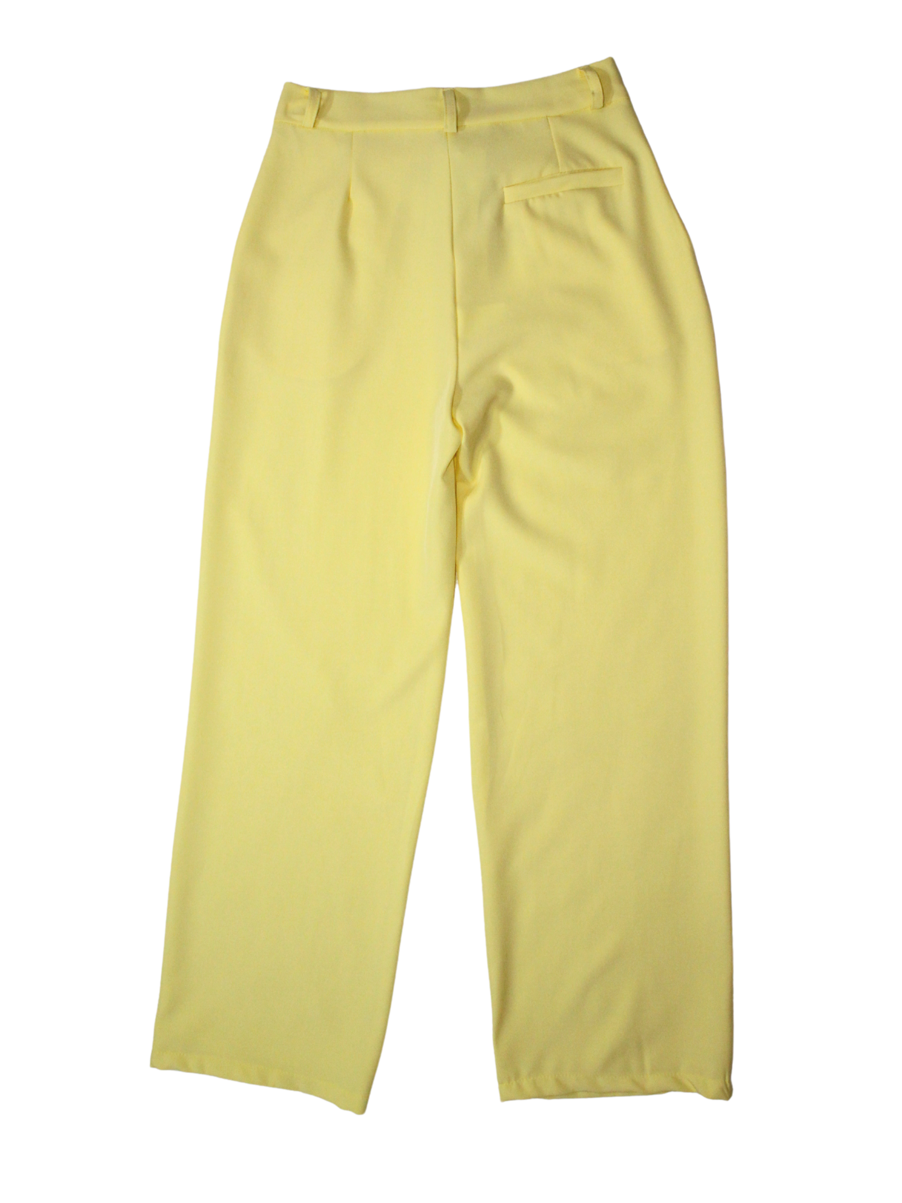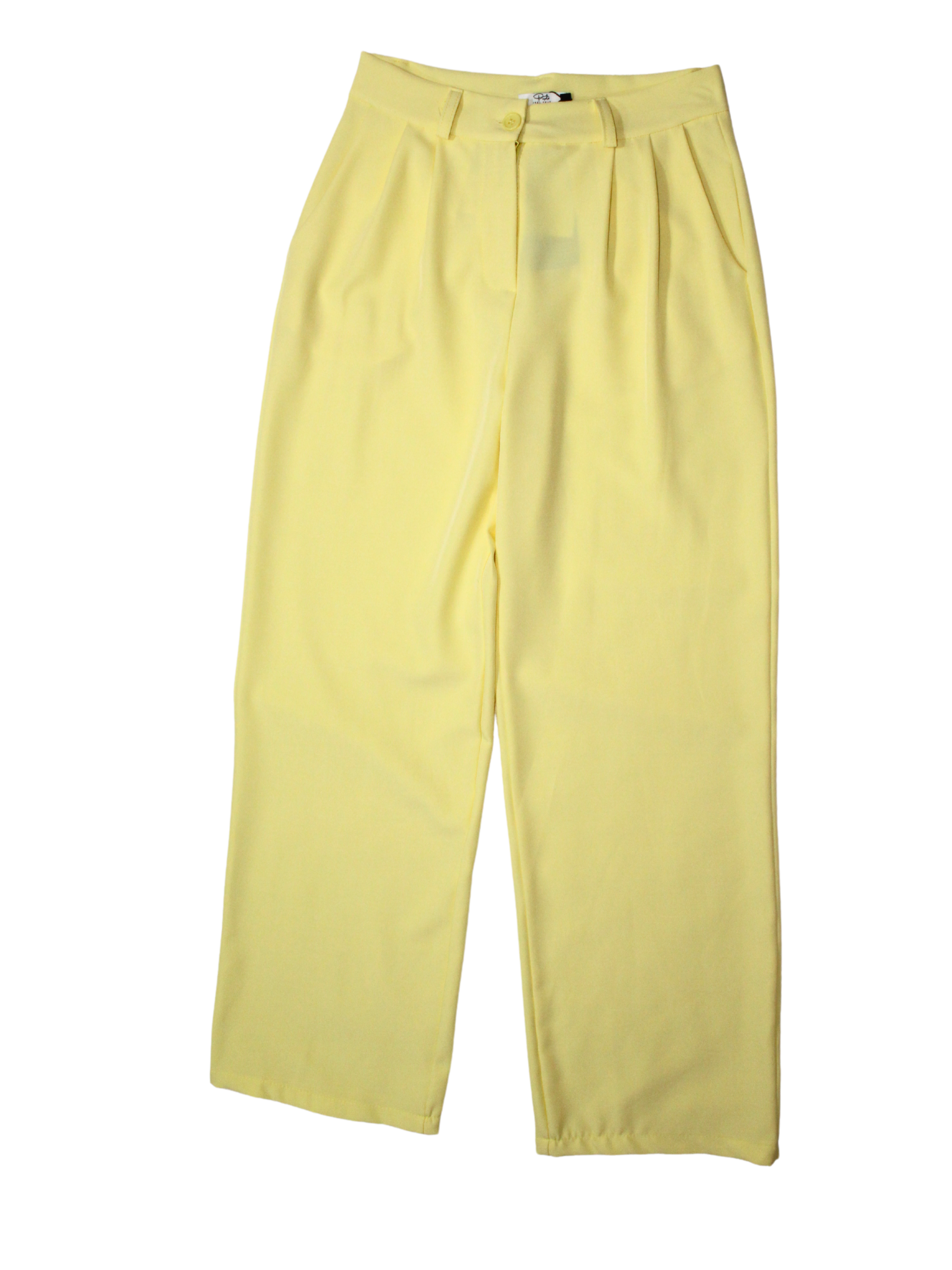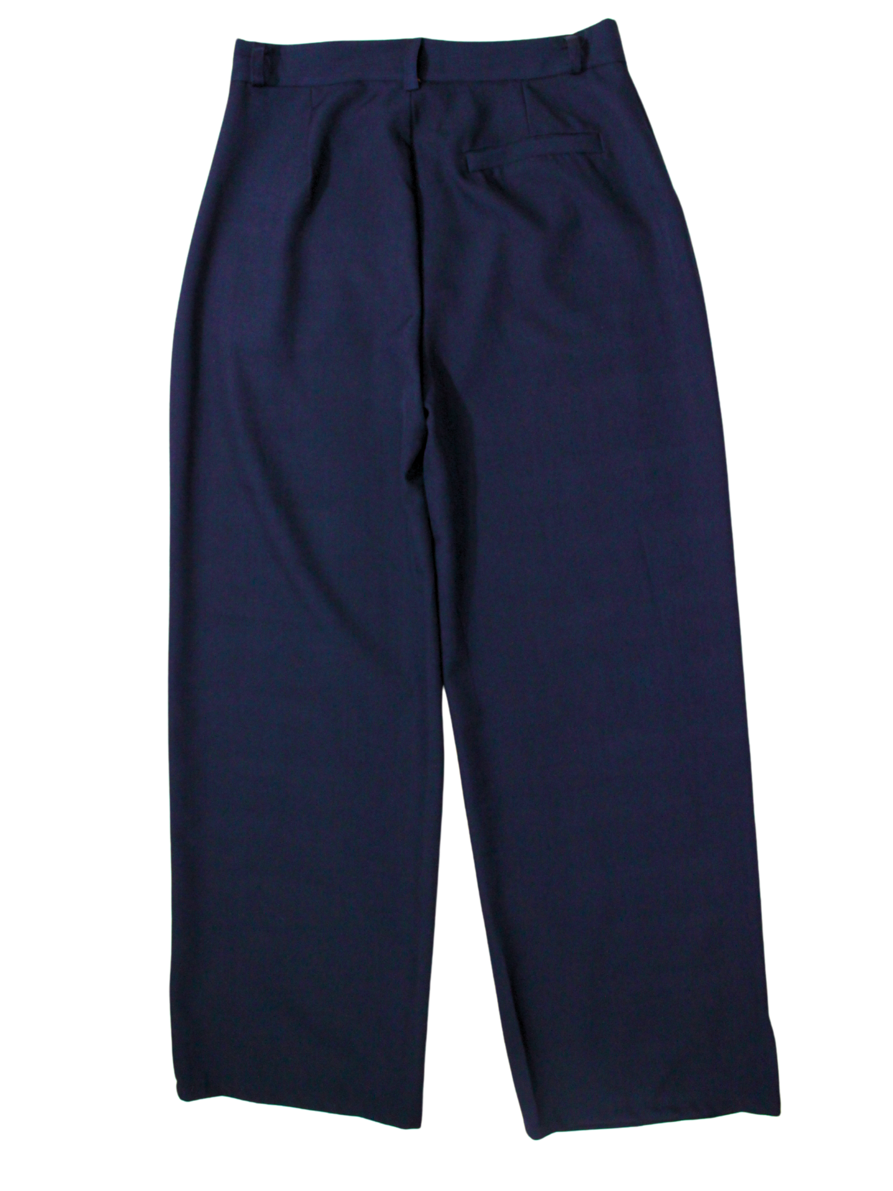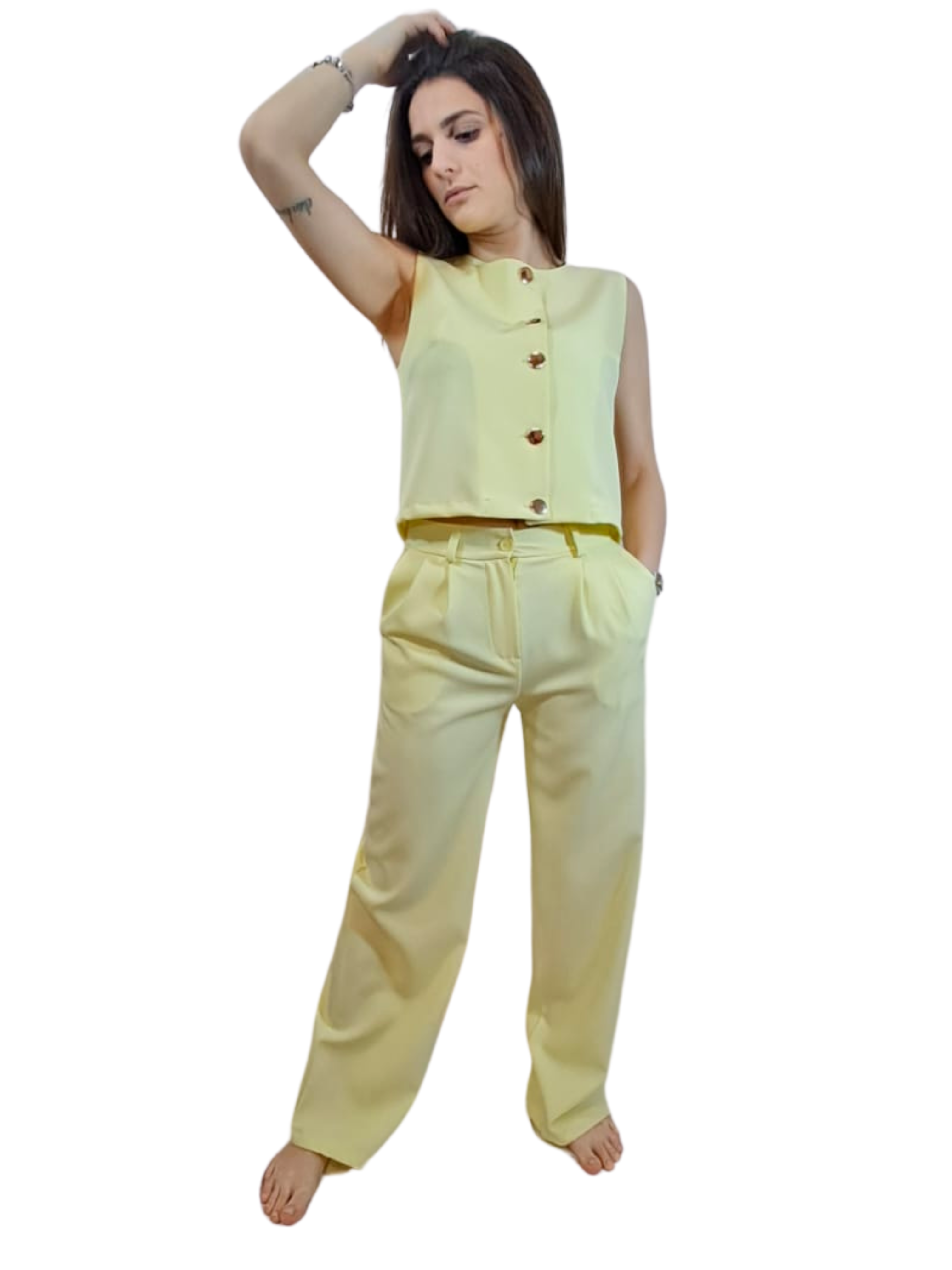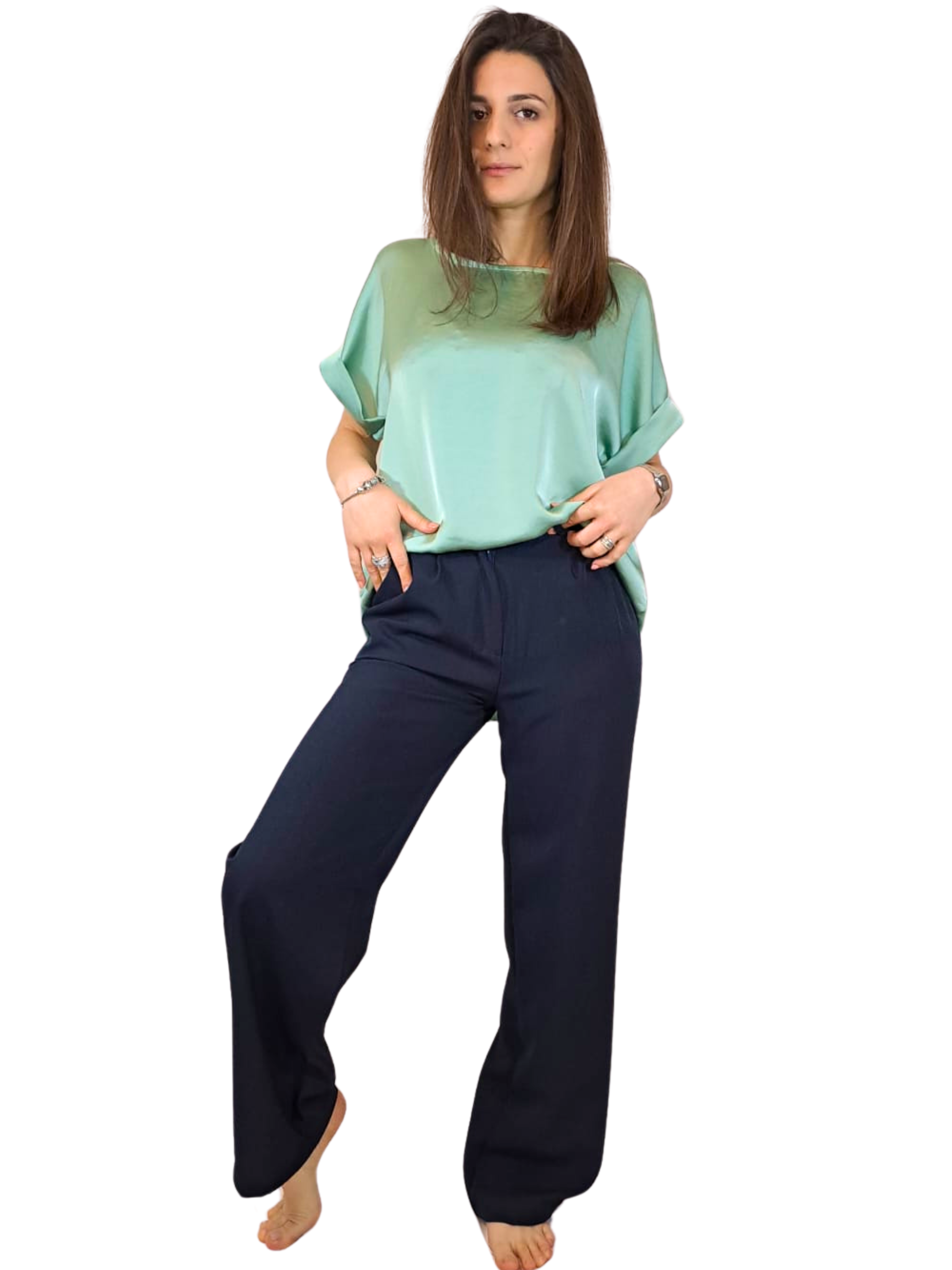 Pantalone a vita media con passanti in vita e tasche laterali. Dettaglio di pinces e piega frontale. Chiusura con cerniera e bottone.